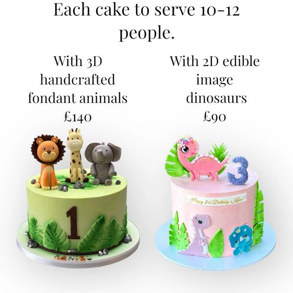 A 6" cake to serve 10 guests with 2D edible sugar print animals, covered with buttercream, costs approximately £90. A cake of the same size with 3D fondant animal figures, covered with fondant and featuring multiple small details, starts from £140.